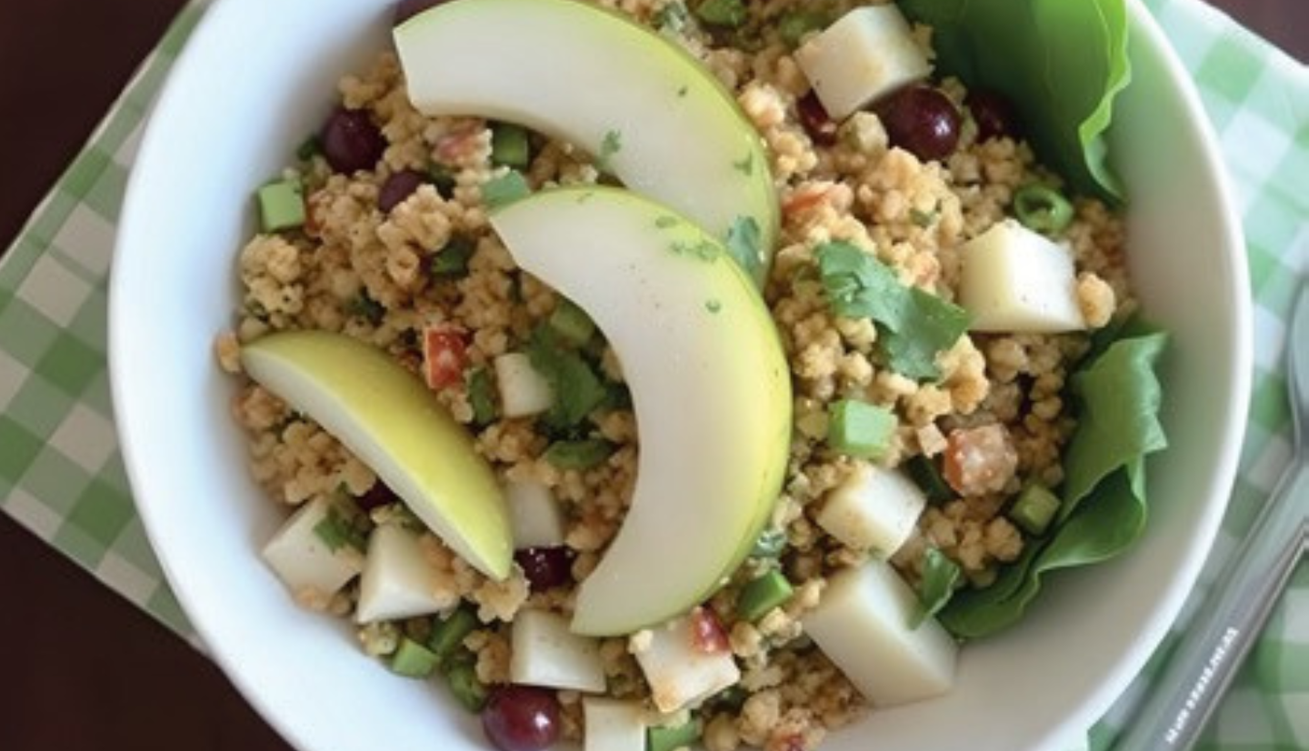 3. Stir the snow peas, pear, bell pepper, pecans, green onion, and sesame seeds into the quinoa.